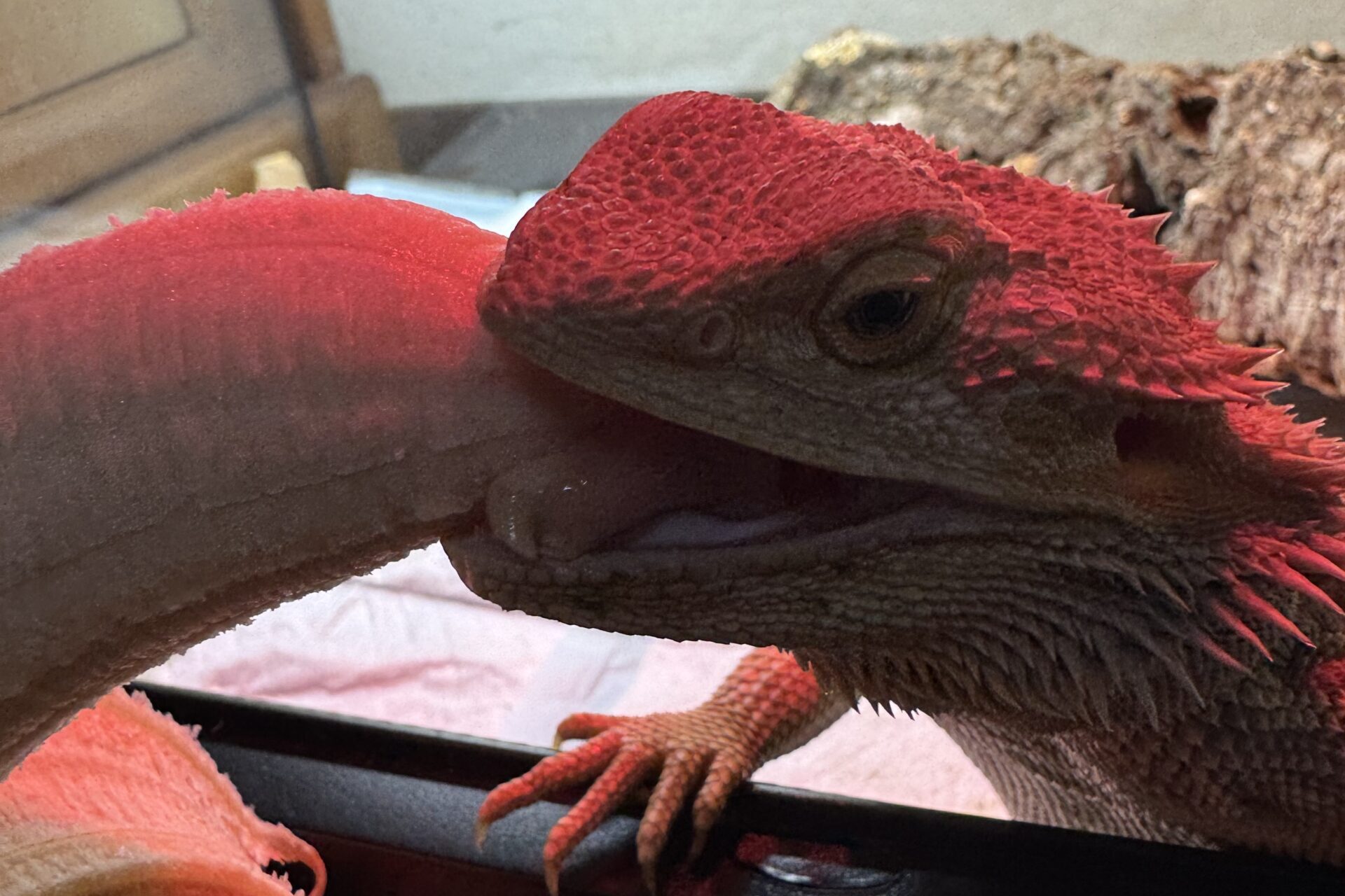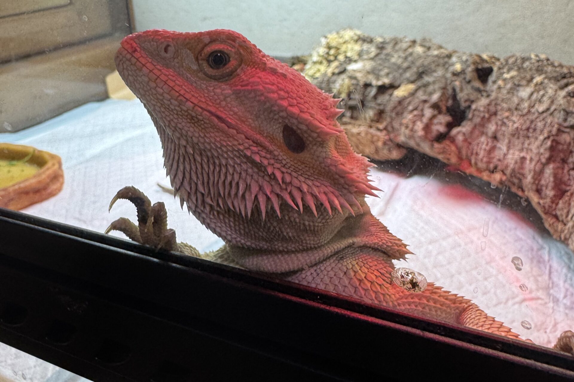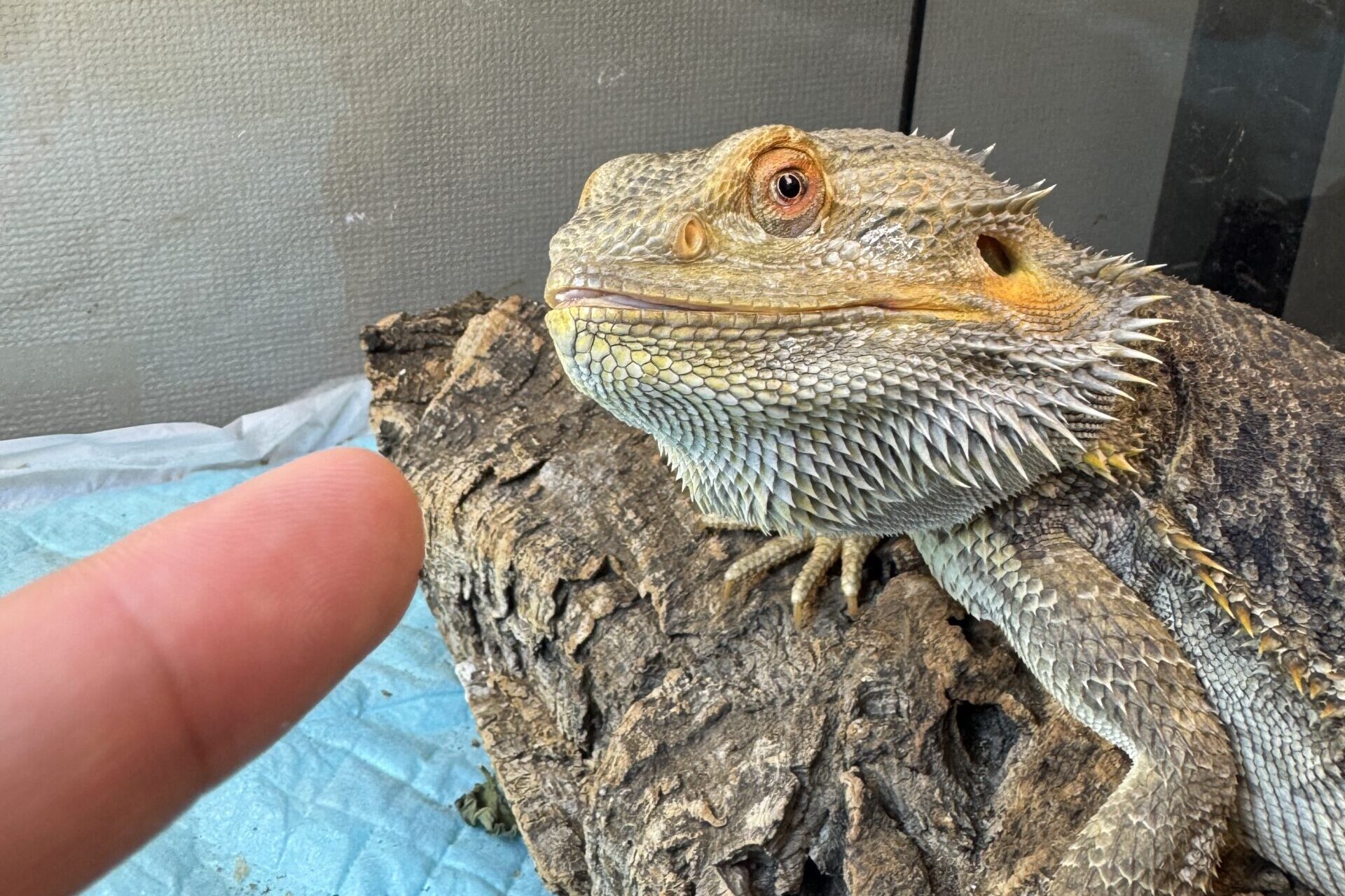 我が家のフトアゴヒゲトカゲも、膝の上で寝てくれたり、飼い主が帰宅すると「エサをくれ!」とケージのドアの前でドタバタするなど、すっかり人馴れしています。