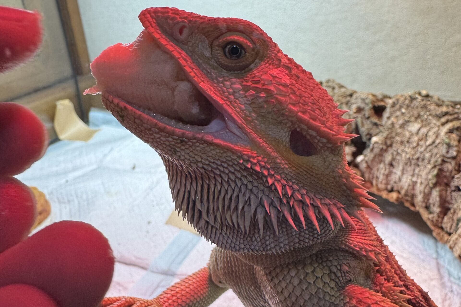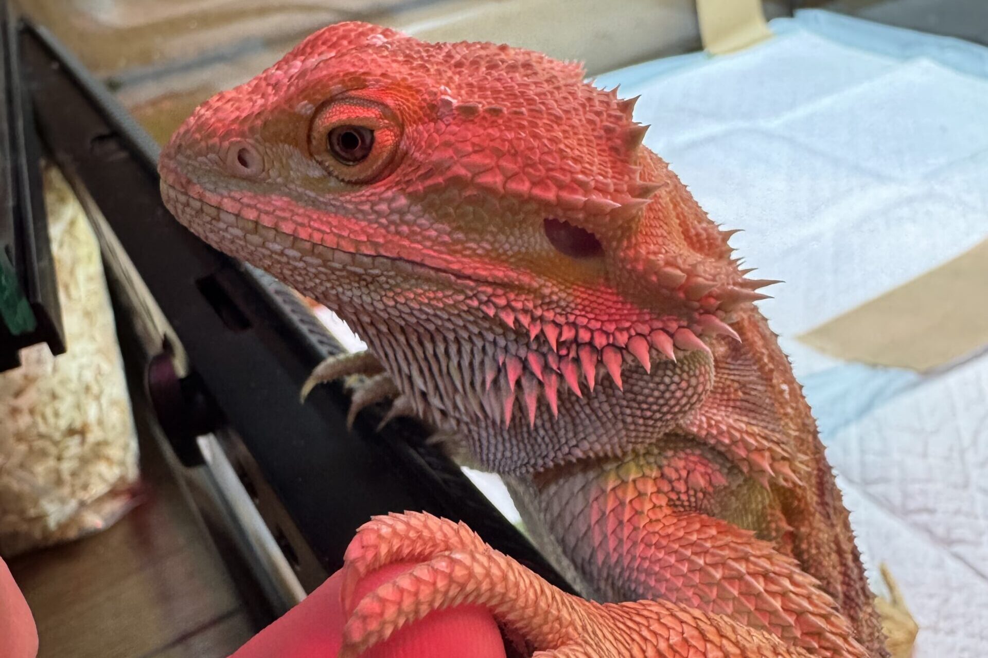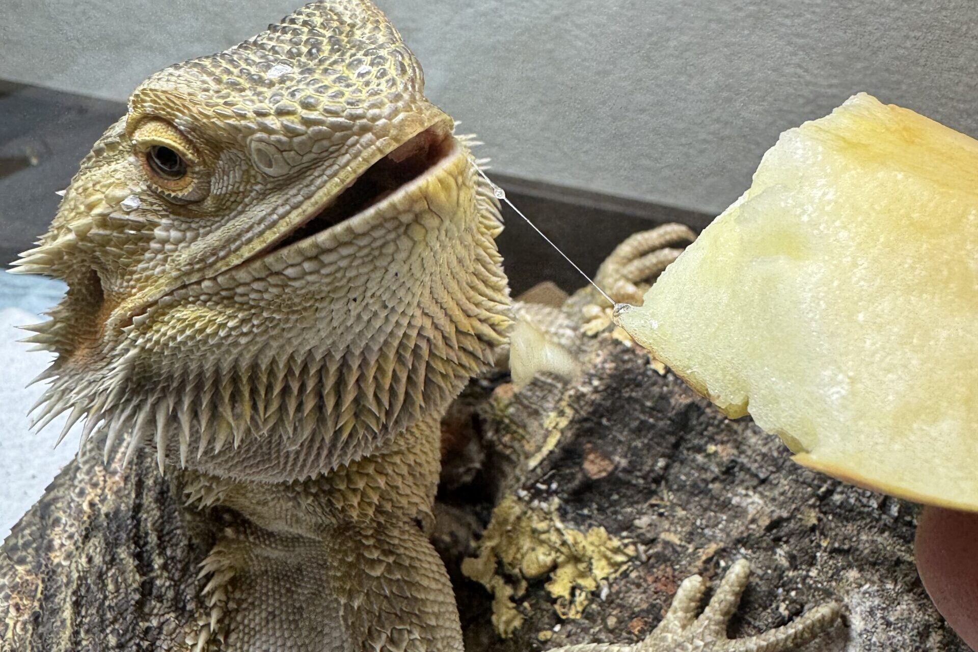 我が家のフトアゴヒゲトカゲも、膝の上で寝てくれたり、飼い主が帰宅すると「エサをくれ!」とケージのドアの前でドタバタするなど、すっかり人馴れしています。