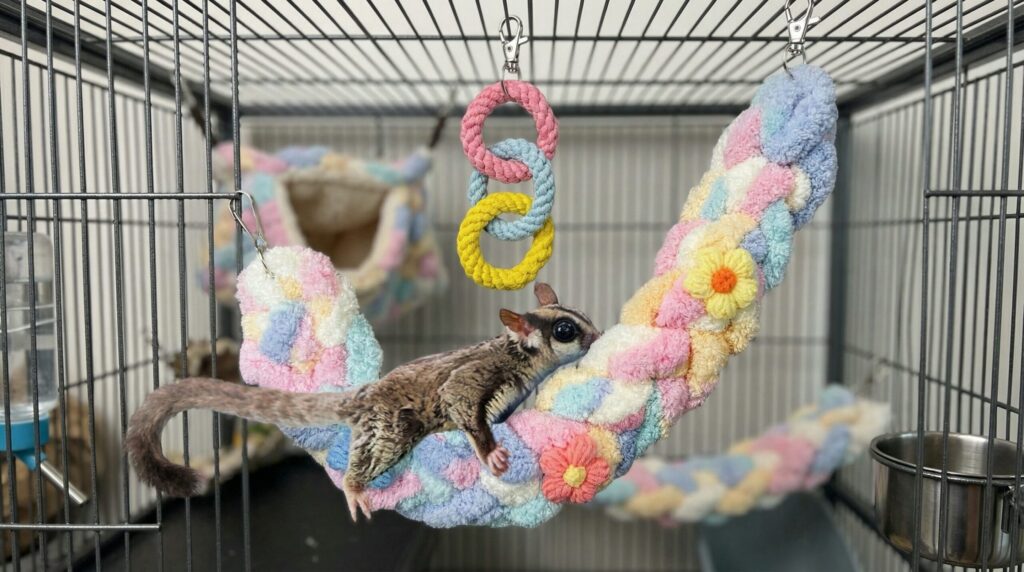 続いては、フクロモモンガのケージが華やかになり、運動不足解消にも効果的である、