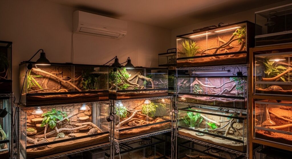 全体的な温度を管理するには、『飼育部屋の暖房』と『サーモスタット』を併用するのが一般的!